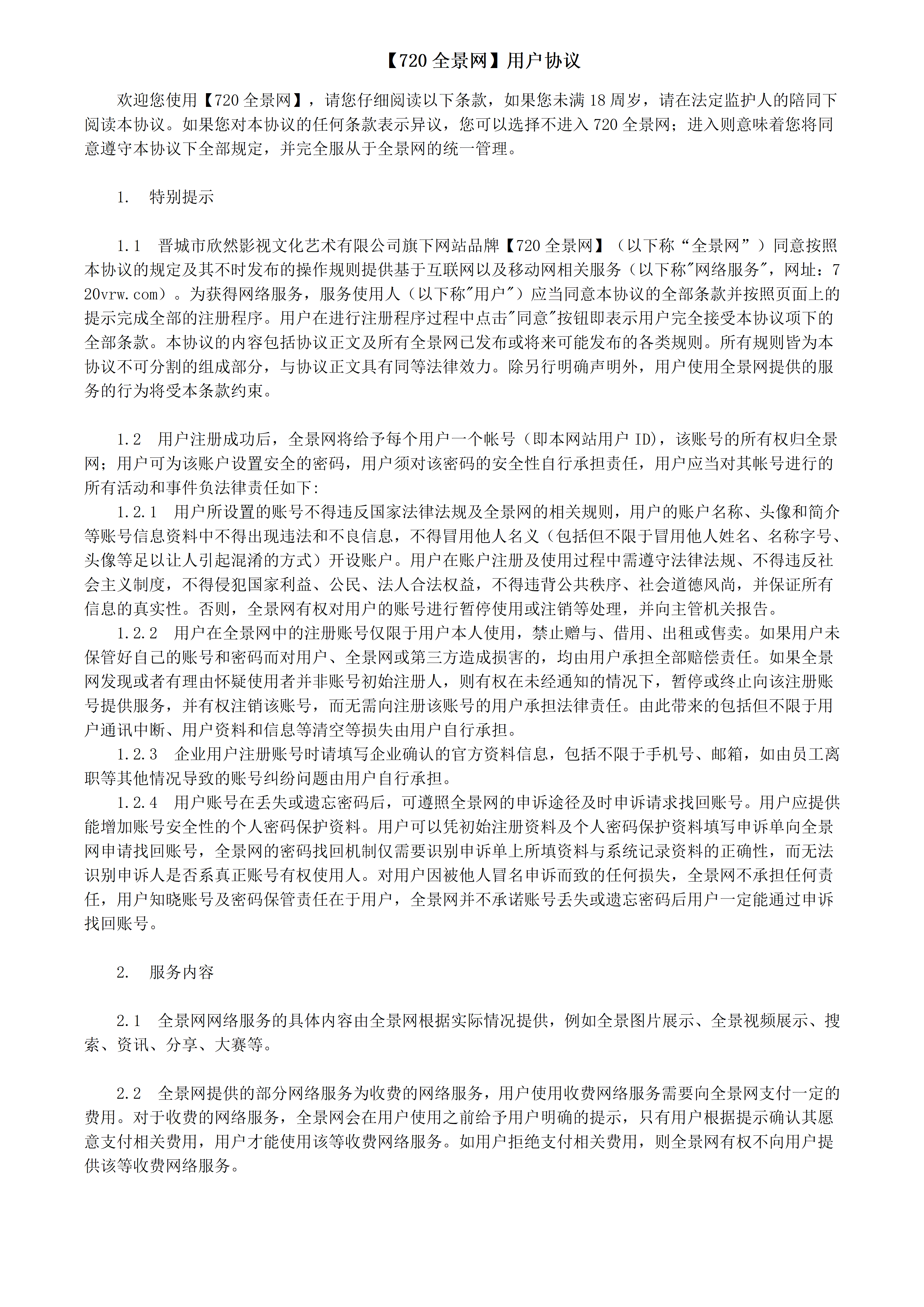 欢迎您使用720全景网,请您仔细阅读以下条款,如果您未满18周岁,请在法定监护人的陪同下阅读本协议。如果您对本协议的任何条款表示异议,您可以选择不进入720全景网;进入720全景网则意味着您将同意遵守本协议下全部规定,并完全服从于720全景网的统一管理。